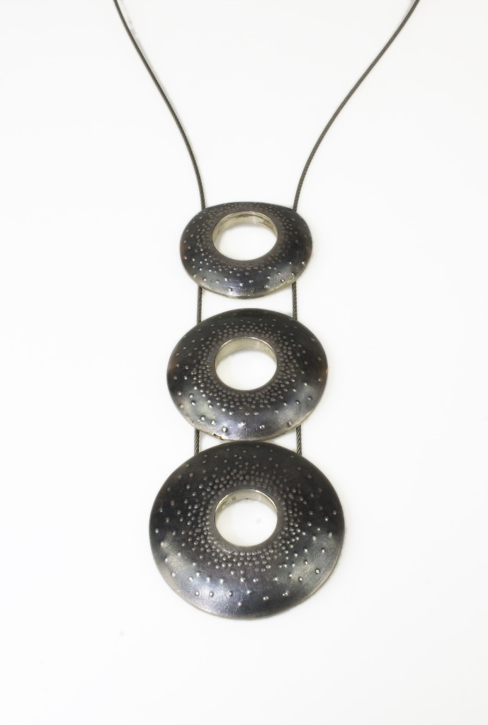 Hollow fabricated sterling silver pendant with 24K Gold and oxidation on a stainless steel cable with sterling silver friction clasp